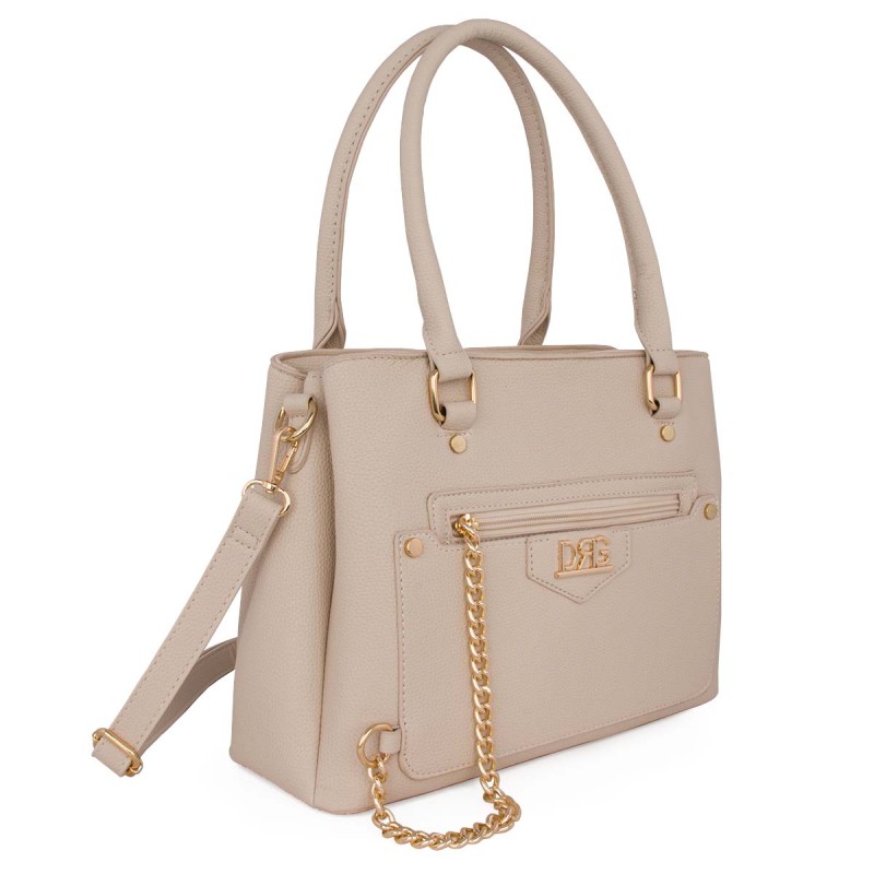 Women's shoulder bag in cream colour. Made of eco-leather. It features 3 separate autonomous compartments with individual zippers, 2 internal slots (one with a zipper), and 1 external zipper pocket on the front. Detachable keychain with zipper. Dimensions: H 25cm, W 32cm, D 15cm. Designed exclusively in Greece by De Raggi designers.
