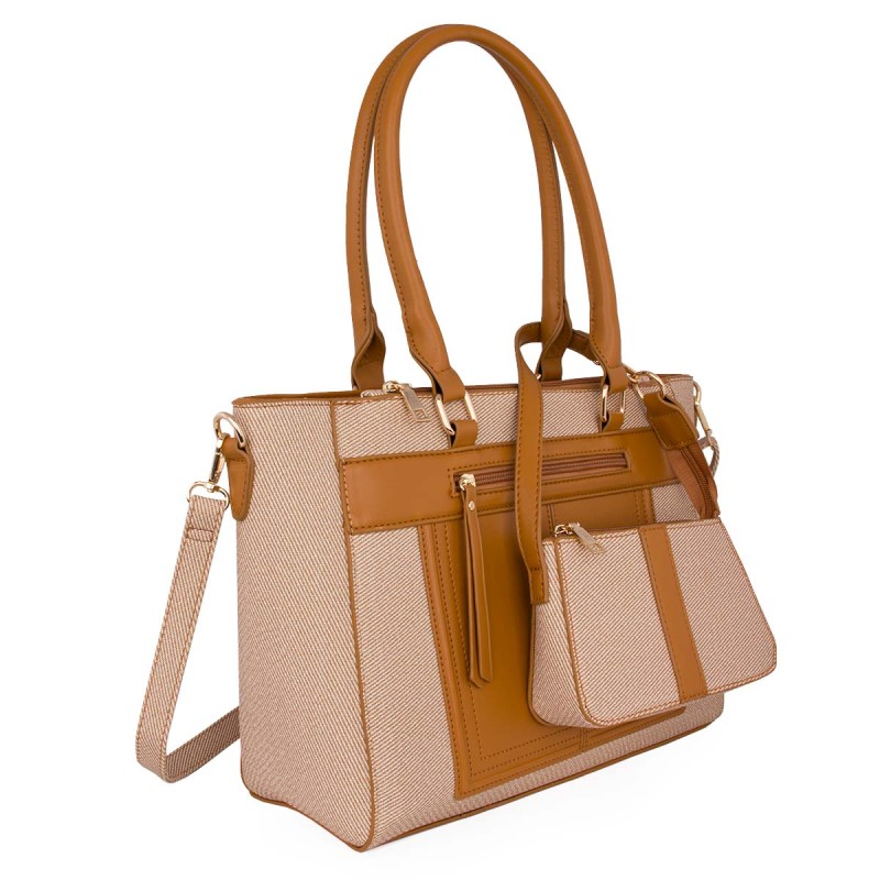 Women's camel shoulder bag. Eco-friendly leather. It has 2 internal compartments, one with a zipper, and 3 external pockets with zippers on the front and back. Adjustable, detachable crossbody strap. Extra detachable pouch with zipper. Dimensions: H 28cm, L 34cm, W 12cm. "Designed in Greece exclusively by De Raggi designers".