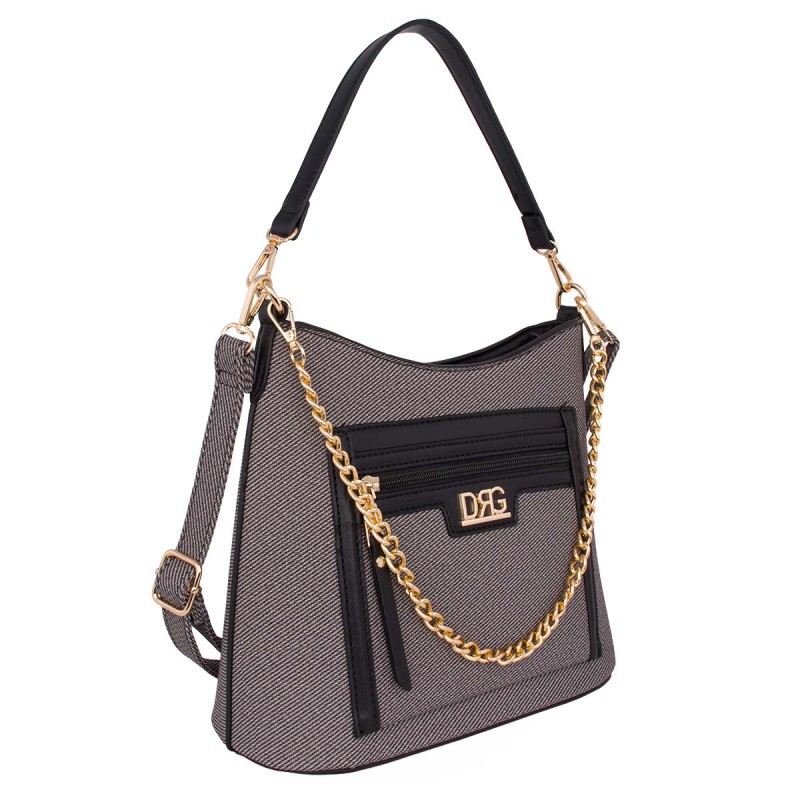 Women's black shoulder bag. Made from eco-leather. It features 2 internal compartments, one with a zipper, and 2 external compartments, both with zippers on the front and back. Adjustable, detachable crossbody strap, detachable shoulder strap, detachable chain. Dimensions: H 26cm, W 28cm, D 13cm."Designed in Greece exclusively by De Raggi designers".