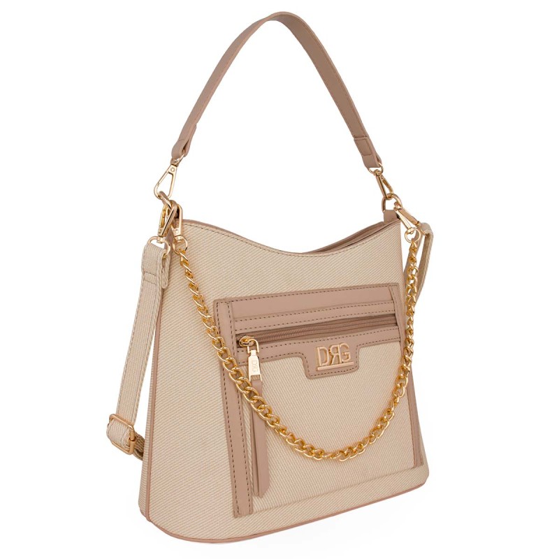 Women's nude shoulder bag. Made from eco-leather. It features 2 internal compartments, one with a zipper, and 2 external compartments, both with zippers on the front and back. Adjustable, detachable crossbody strap, detachable shoulder strap, detachable chain. Dimensions: H 26cm, W 28cm, D 13cm."Designed in Greece exclusively by De Raggi designers".